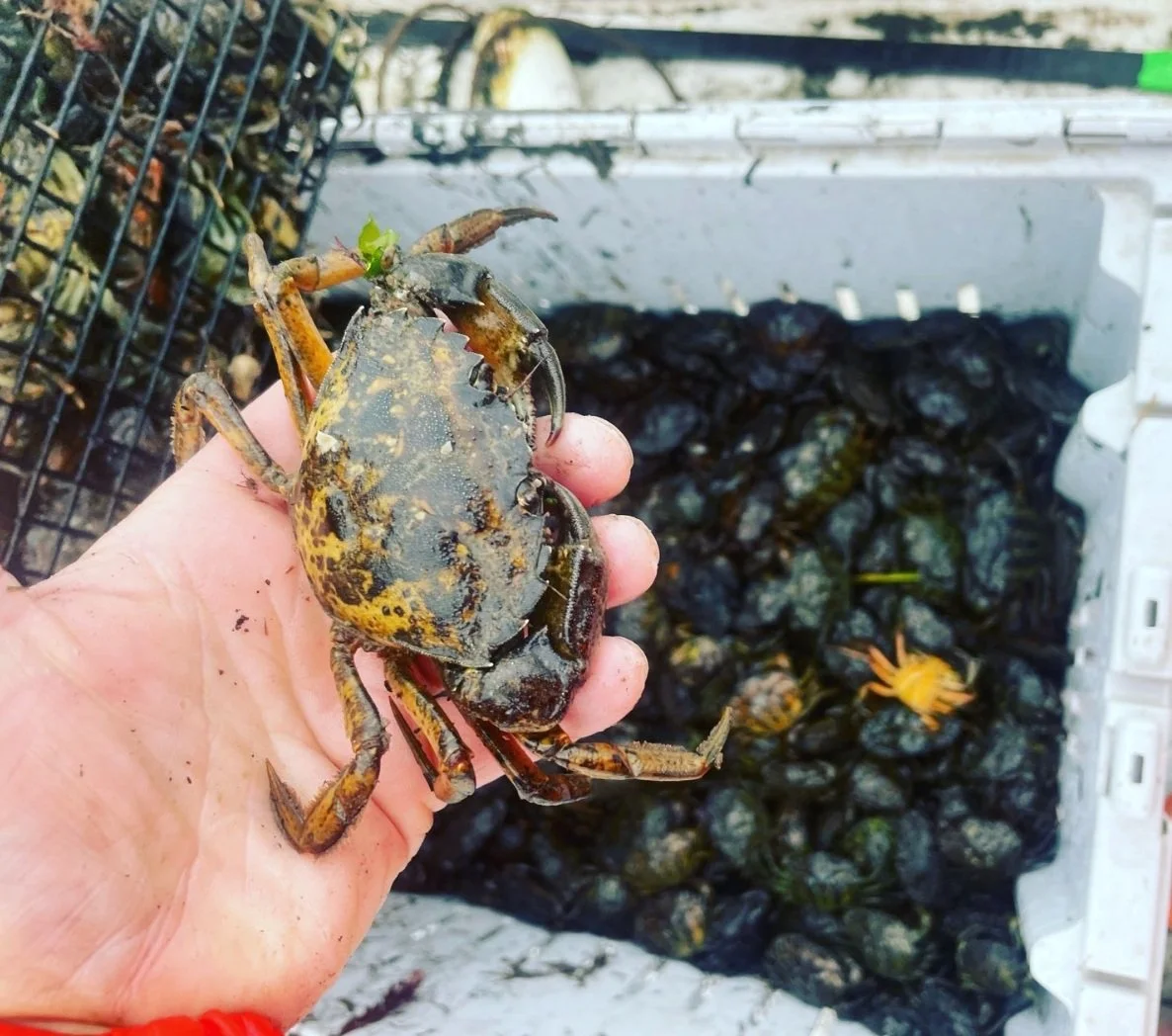 We had a chance to chat with Pete Mason, Captain of the F.V. Kestrel and H. Cole Club Charter Experience. Pete and his wife Cara are also green crabbers and founders of Zombie Green Crab Co.: A green crab operation out of Marshfield, Massachusetts. They specialize in green crabs sold for culinary use and have previously partnered with GreenCrab.org Board Member Chef Youji Iwakura on educational charters where participants had the chance to learn about green crabs and taste the invasives prepared by Youji. They also sell green crabs for use as bait and hopes to expand his operation this summer.