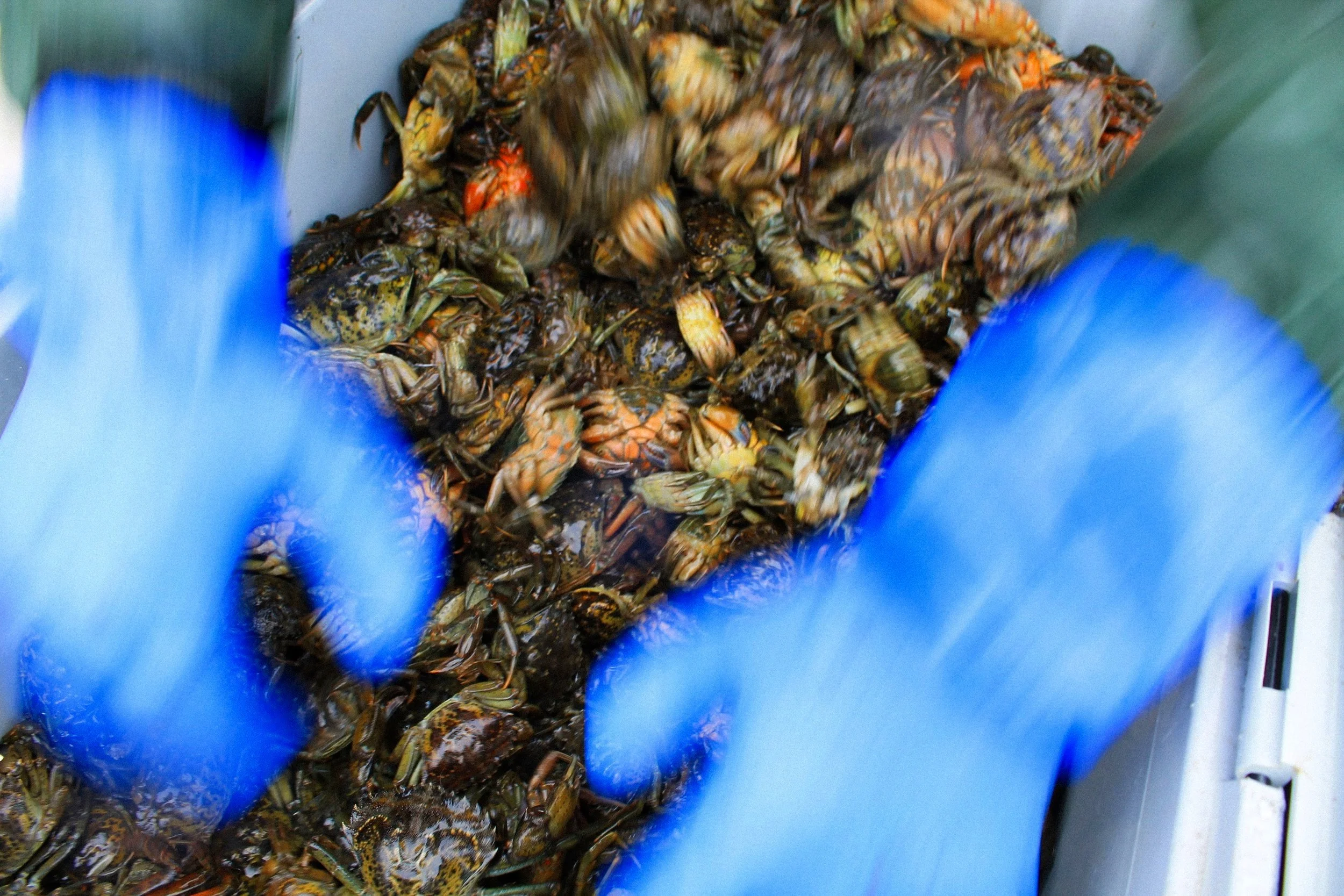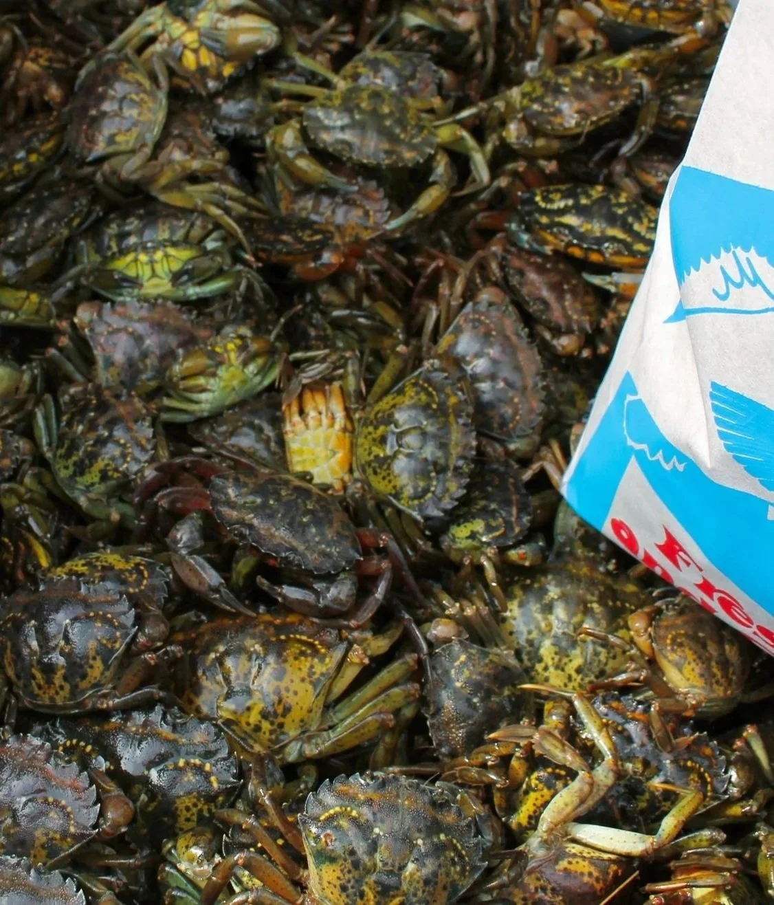 To note, some markets are carrying live green crab while others may be offering frozen green crab or take-home sauces and items. Please refer to state and federal regulations regarding interstate transfer, sale, and capture of invasive green crabs. Selling and transporting live green crab is not legal in all states. Those with crustacean or shellfish allergies should not consume green crab.
